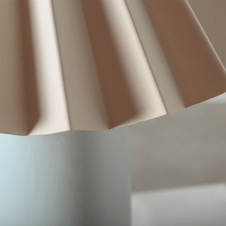 The Blaze Table Lamp features a sculptural design that brings a cohesive balance of form and texture to any space. The base, made from terracotta and finished in a light teal tone, offers a grounded, organic feel. The fluted iron shade curves gracefully, creating a harmonious contrast between the smooth base and the textural, metal shade. The neutral beige tones of the shade add warmth and refine the overall design.