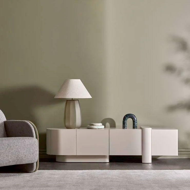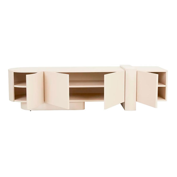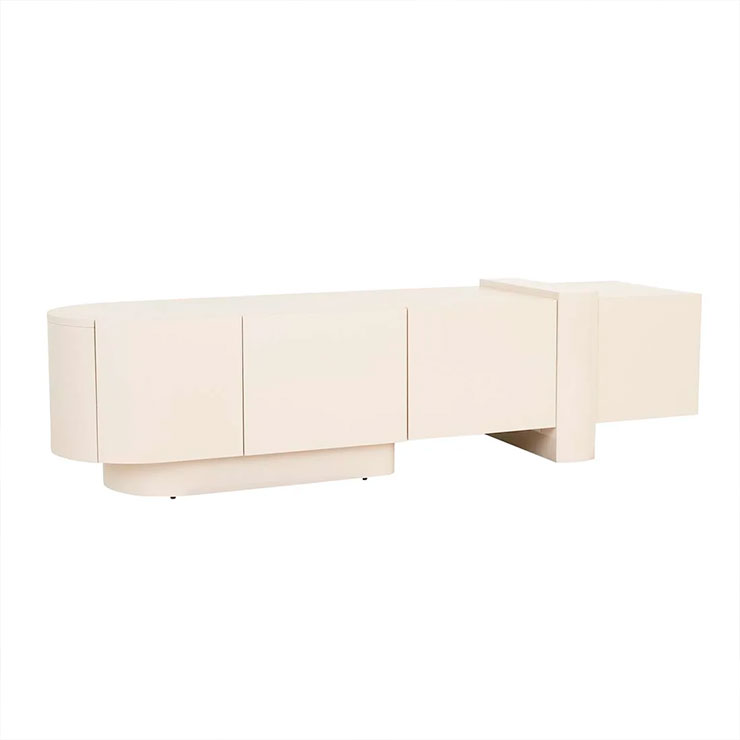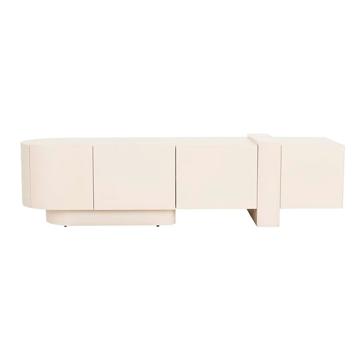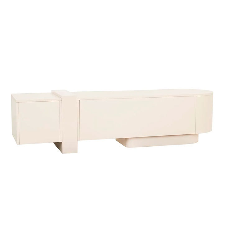 The Comet Entertainment Unit in Super Gloss Oatmeal combines modern design with practical features. Its bold asymmetric design and gloss lacquer finish provide a sleek and stylish look. Equipped with Hettich hardware, this unit offers both functionality and a contemporary aesthetic, making it perfect for modern living spaces.