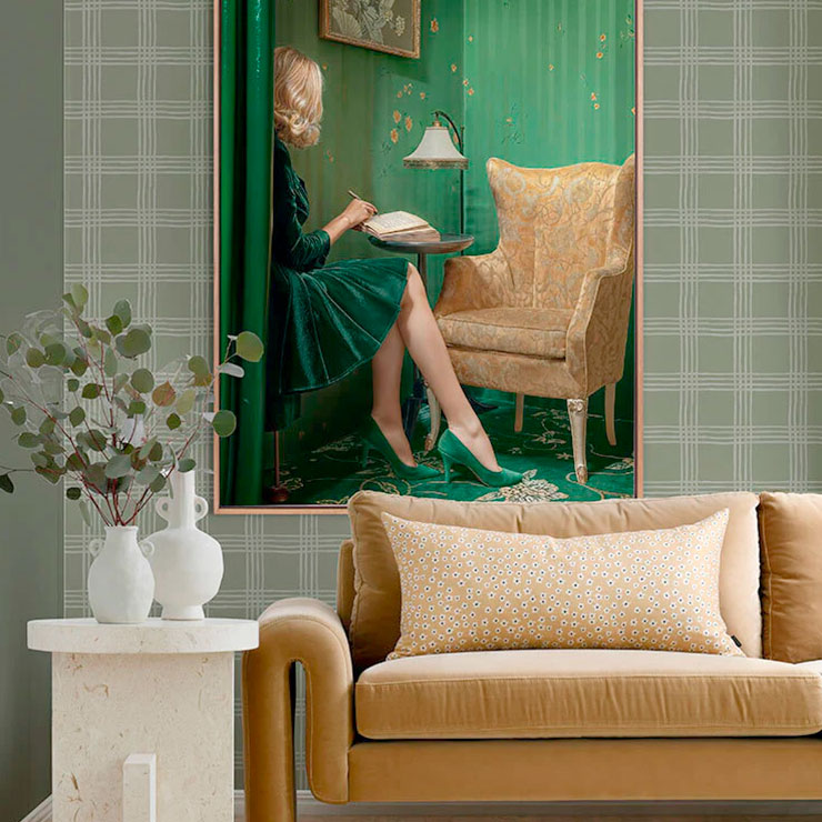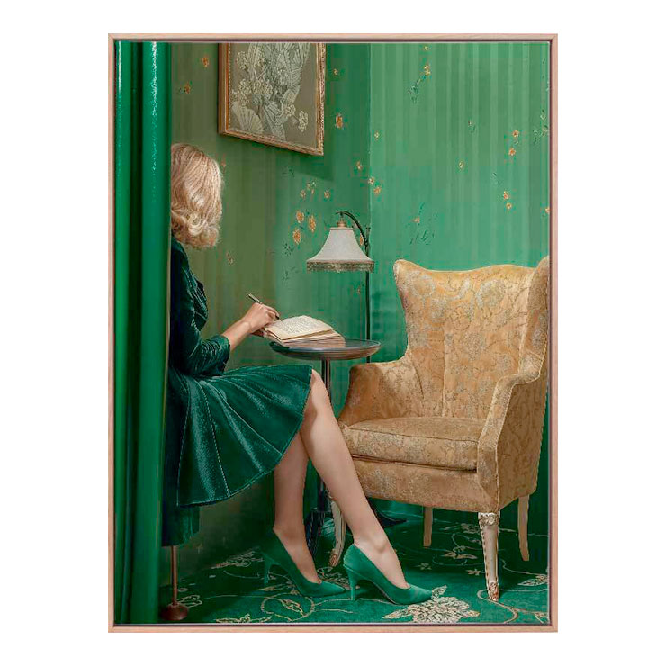 Dear Diary Canvas Art Print – Sitting in her mid-century modern room, packed with art deco vibes, a woman writes in her diary. The bright green shades, juxtaposed by golden yellow tones, gives this retro wall art a sense of serene nostalgia. With the charm of a bygone era, this piece is an ideal addition for any bedroom or living room.