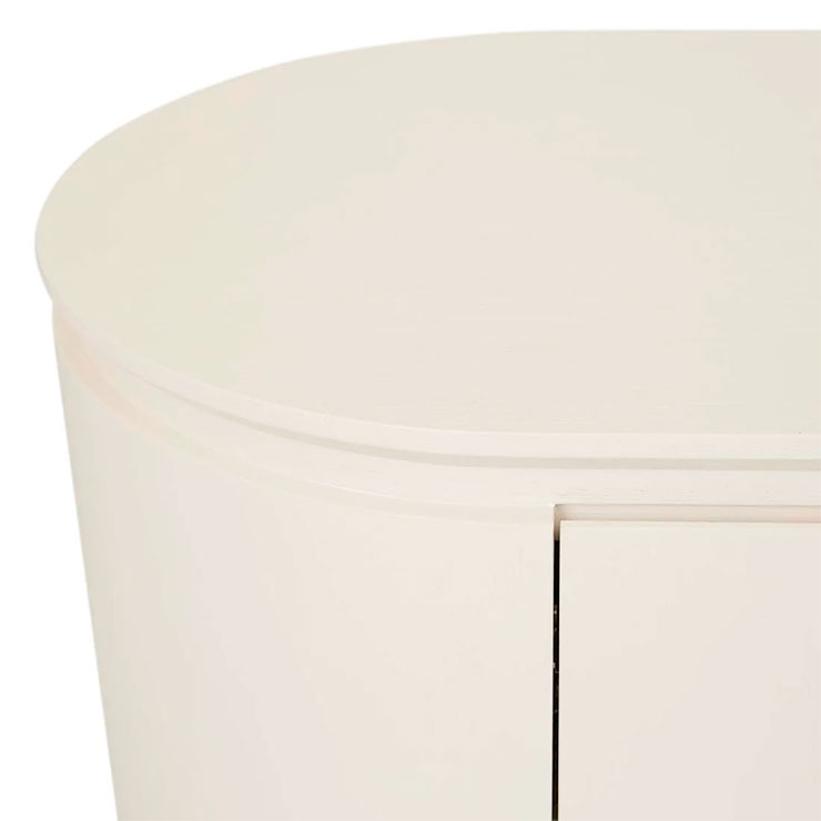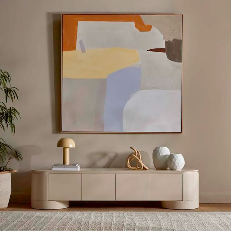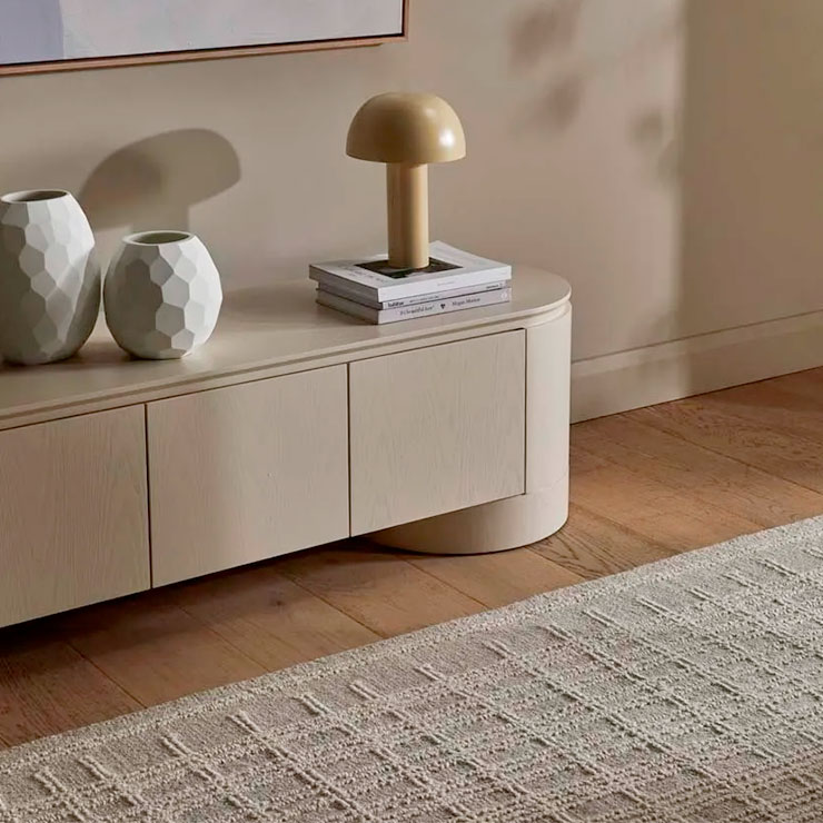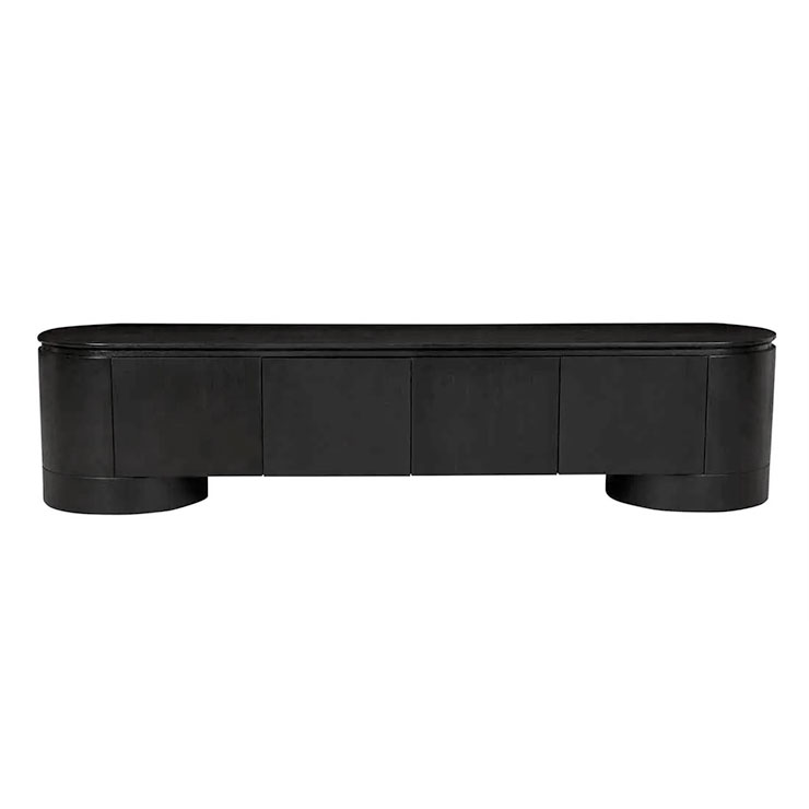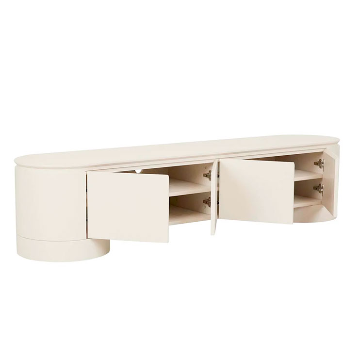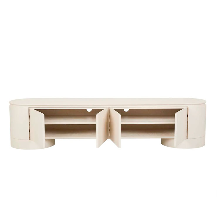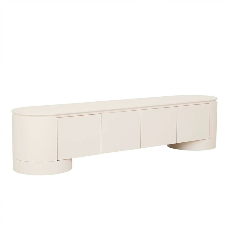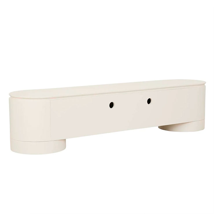 The Pluto Entertainment Unit makes a bold statement with a minimalist form. Impressive circular legs complement the rounded silhouette. Designed for contemporary or modern space, offering both storage and style.
